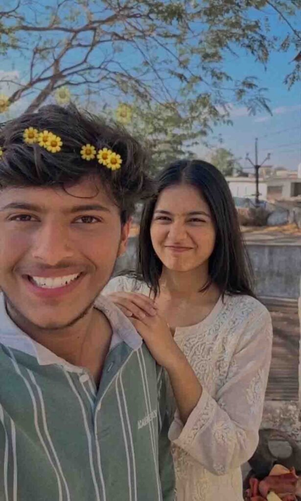 Include a beautiful 19-20 year old North Indian girl standing close beside me. She is dressed in an elegant Indian chikenkari kurti, with straight, open hair flowing naturally. Her hands are resting gently on my shoulders, and she is making a cute, playful expression. Apply the same filter to her face so the overall look remains consistent and natural. The photo should appear realistic and high quality. Please make sure my face remains completely