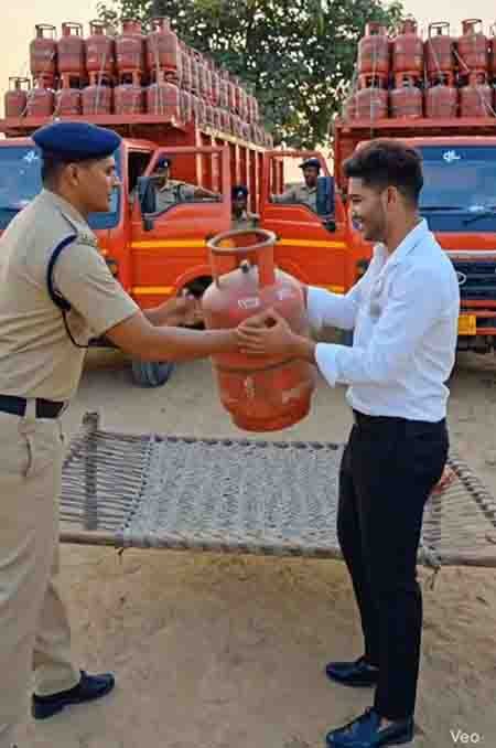 A realistic cinematic scene where the boy from the original photo is already seated in the exact same position. The background remains unchanged. From the far background behind him. two Large trucks fully loaded with red LPG gas cylinders slowly arrive and stop beside him, with the entire trucks clearly visible in the frame. The trucks are driven by uniformed Indian police officers. One officer steps down, walks to the boy, and hands him an LPG gas cylinder. The boy accepts it while remaining seated, with subtle head movement. Natural motion, realistic interaction, cinematic lighting, hyper-realistic, steady camera, no zoom, 4K video