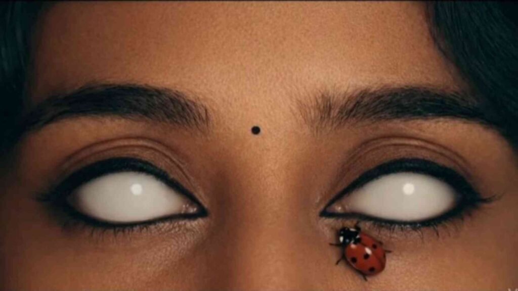 A close-up cinematic shot of a woman's face with glowing white eyes, slight slow motion movement, soft blinking effect, realistic skin texture, a red ladybug slowly moving near the eye, dramatic lighting, dark cinematic background, high detail, smooth camera zoom in, 4K quality, realistic animation
