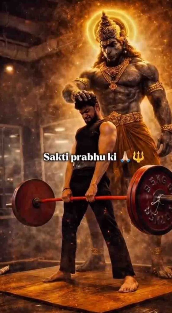 Ultra-realistic cinematic digital art of Lord Hanuman (Bajrangbali) standing behind a me doing a heavy deadlift, Hanuman blessing him by gently placing one hand on his head and make full photo. Lord Hanuman is tall, muscular, divine, grey stone-like skin, wearing golden crown (mukut), ornaments and dhoti, glowing golden aura and halo around his head, powerful spiritual energy. Modern gym interior, barbell loaded with heavy plates, wooden lifting platform, dramatic lighting. Epic devotional + fitness fusion, dust particles, smoky atmosphere, golden sparks floating in air. Hyper-detailed muscles, realistic skin texture, sweat on athlete, sharp focus. Cinematic composition, low angle shot, 8K ultra HD, high contrast, volumetric lighting, godly glow, masterpiece, unreal engine, ultra-realistic fantasy realism. And same to same no any change in body.