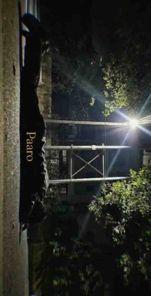 Dim Indian apartment buildings, shop lights, and decorative LEDs glow softly in the background.